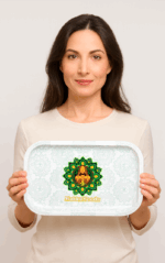 Bandeja metálica para enrolar Makka Seeds, la solución perfecta con el tamaño ideal para un armado cómodo y en cualquier lugar. Fondo claro